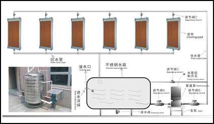 濕簾是安裝在窗戶的另一側(cè),空氣穿過濕簾蒸發(fā),再由風扇吹向各各角落,致使室內(nèi)溫度迅速下降起來。