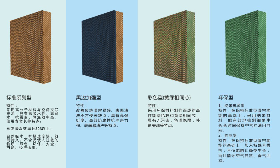 綠色濕簾型號:5060/5090/7060/7090 優(yōu)質(zhì)濕簾還不含易使皮膚過敏的苯酚等化學物質(zhì),安裝使用時對人體無毒無害,綠色、安全、節(jié)能、環(huán)保、經(jīng)濟。